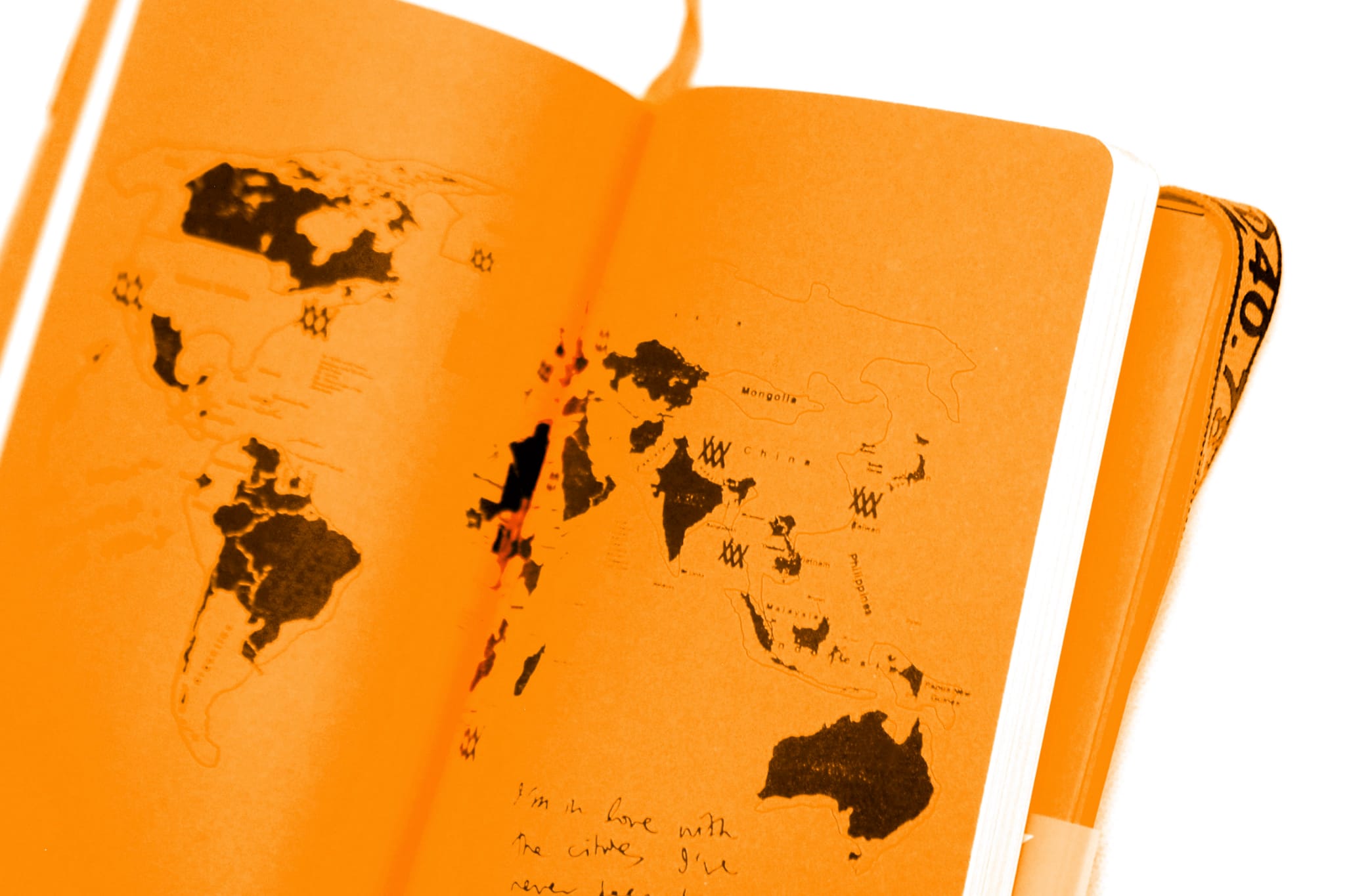 用者可使用熒光色帶上顯示的經緯度來找出日誌封面的景點,以另一種體驗方式探索。迷你袋設計亦可安全保存門票和旅行地圖等收藏品。