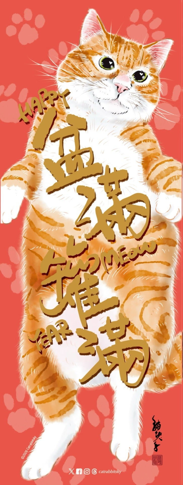 ♥️躺平黃貓長方,印有盆滿罐滿happy meow year字樣。