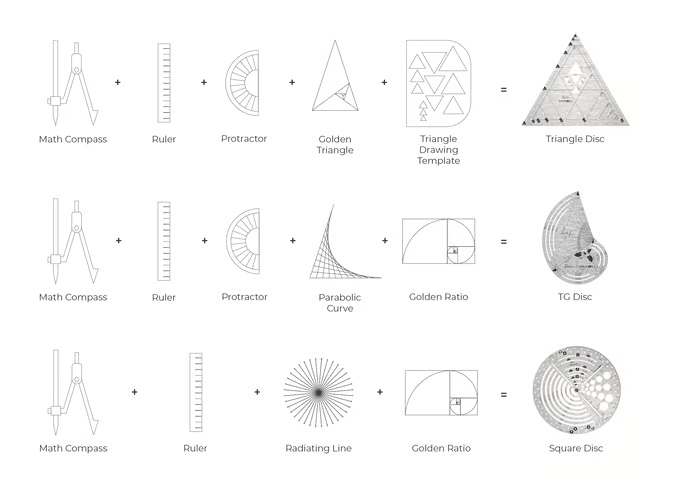 The Exlicon L Golden Ratio Tool Set includes the TG, Triangle, and Circle tools, which are multifunctional tools that include features for drawing geometric shapes and degrees in golden ratio.