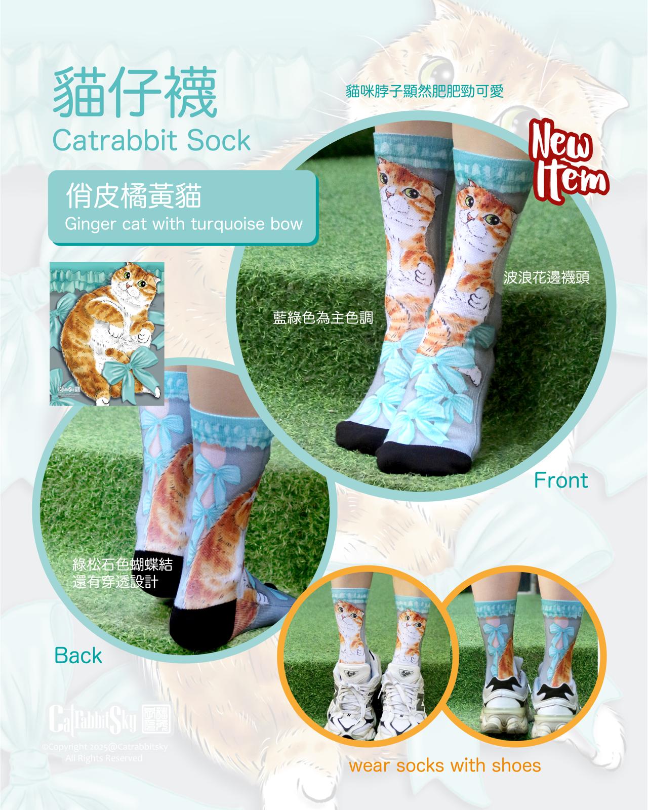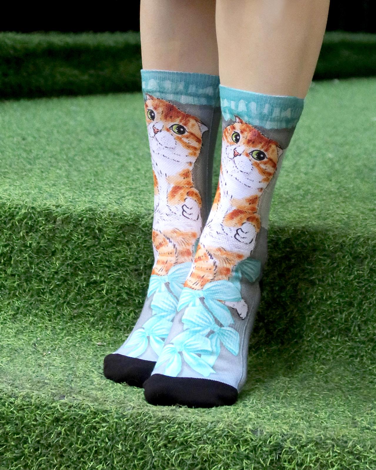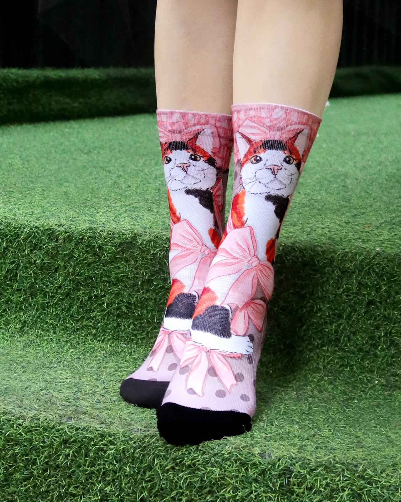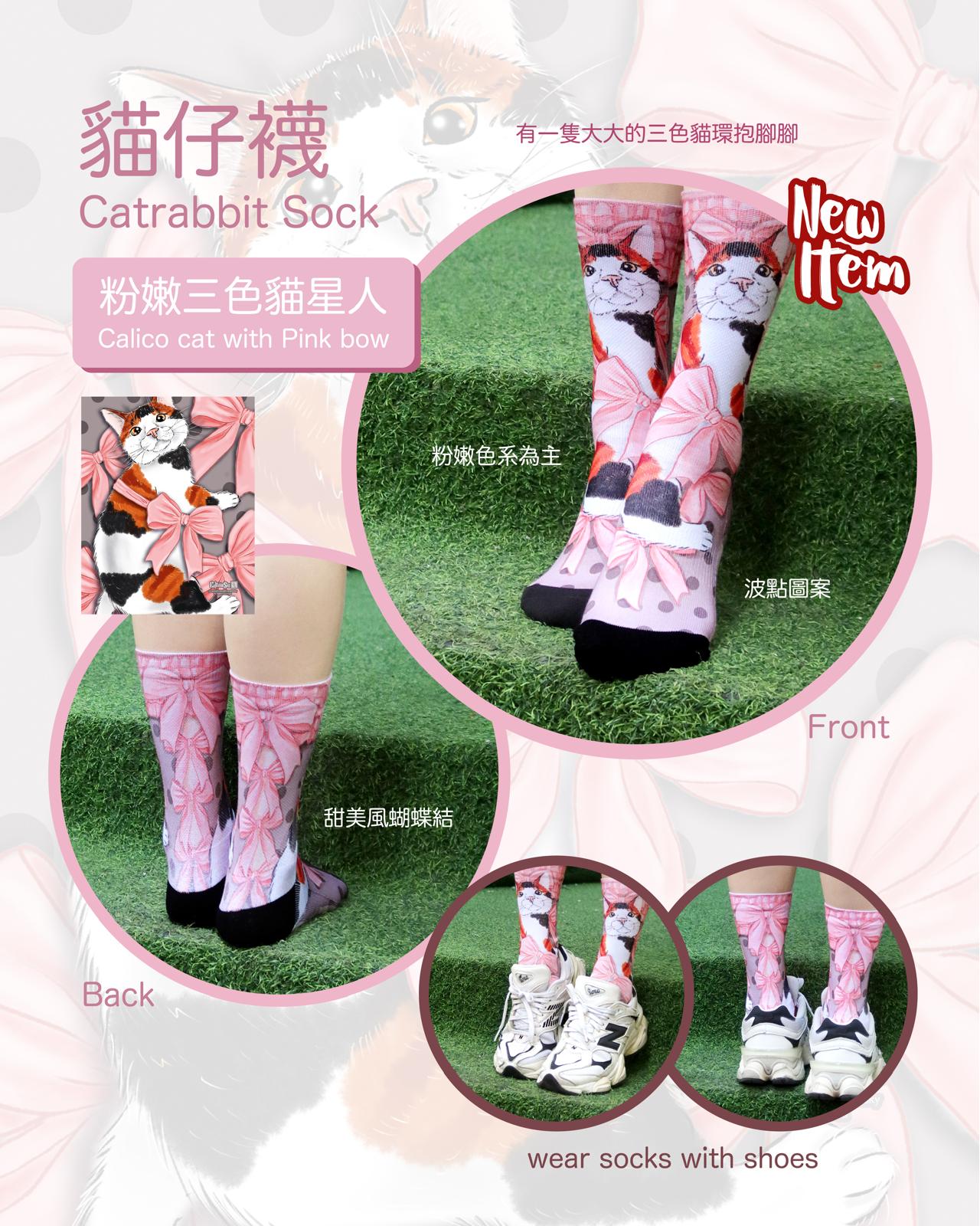 • 襪子正面有一隻大大的三色貓環抱腳腳,表情溫柔可愛,眼睛圓滾滾,戴著一個粉紅色的大蝴蝶結。