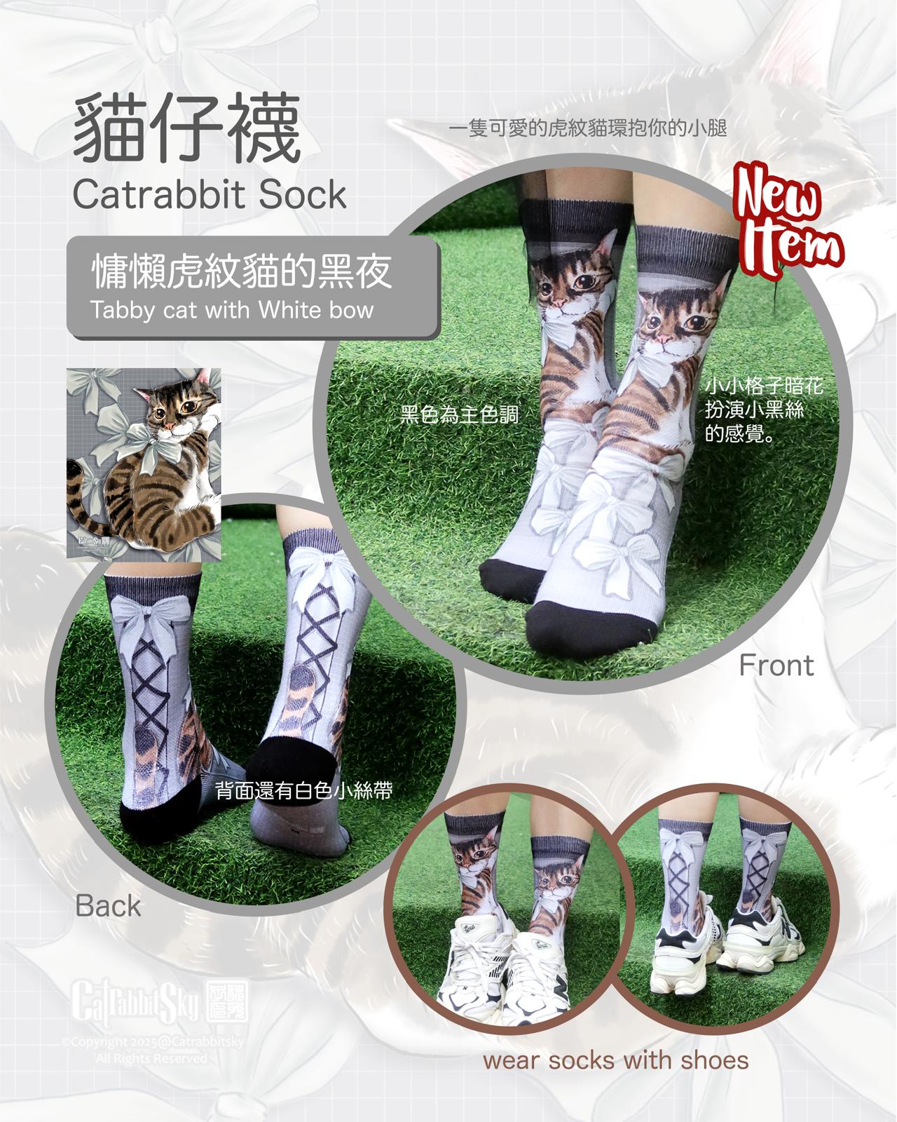 • 襪子正面是一隻可愛的虎紋貓,貓咪有瑪瑙色的眼睛,表情嬌嗲,坐著環抱你的小腿。